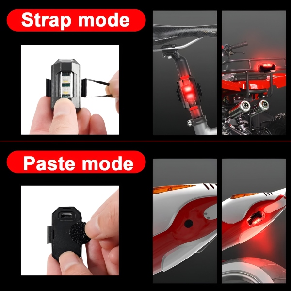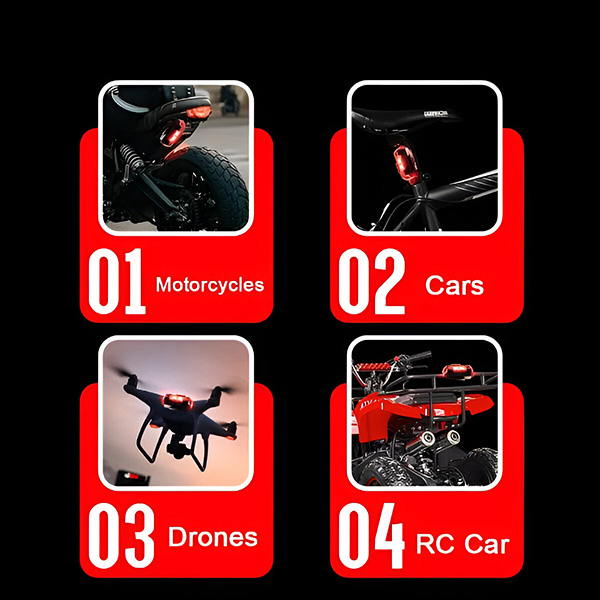 Овие светла се неверојатно универзални и дизајнирани да се прилагодат на автомобили, мотоцикли, велосипеди и дронови. Можете да изберете помеѓу методите на инсталација со велкро или со гумено прстенче за едноставна и сигурна инсталација. Не е потребно комплицирани алатки или професионална помош.