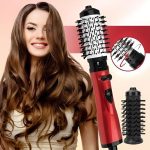 Овој стилизатор и сушач за коса со топол воздух е опремен со две ротирачки заменливи четки.
