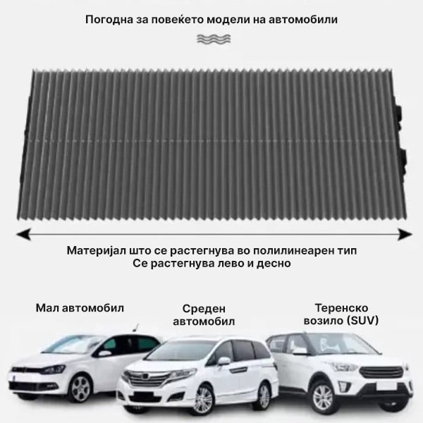 Оваа сенка е дизајнирана да одговара на широк спектар на возила, вклучувајќи автомобили, комбиња, камиони и СУВ. Универзално е вклоплива бидејќи можете едноставно да ја исечете ширината на посакуваната мерка.