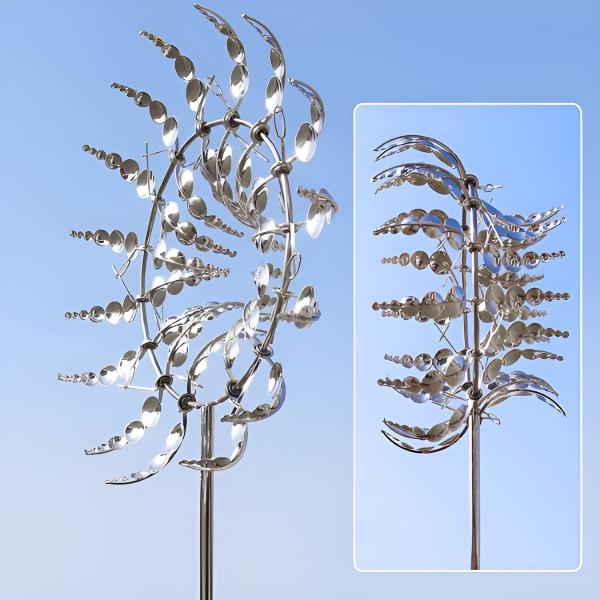 🌬️ Нејзиниот дизајн со двојни лопатки создава хипнотичка претстава и е отпорен на ветровити денови, совршен за декорација на надворешни простории без напор.