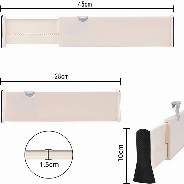 Без разлика дали станува збор за кујнски прибор, тоалетни производи за бања или чорапи во спалната соба, овие прегради се прилагодуваат од 28 cm до 45 cm за да одговараат на повеќето фиоки. Можете да го прилагодите просторот токму како што ви е потребно.